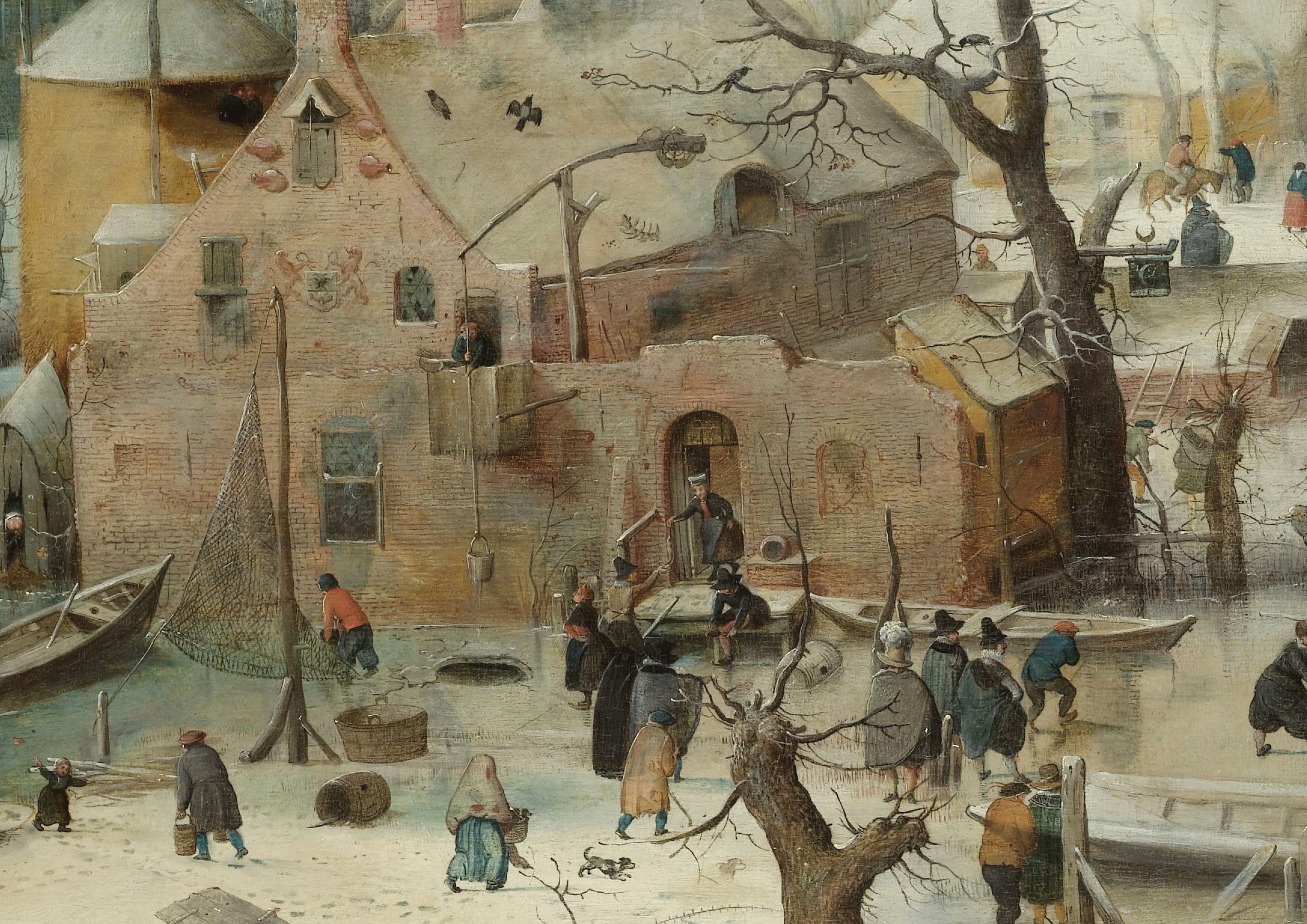 From the woman at her doorstep, giving food to the workers - to the birds squawking in the treetops, and the little dog running along the snow - to the child at the far left, who has just dipped their hand in the icy water and is now running back to their parent in tears over the shock.
